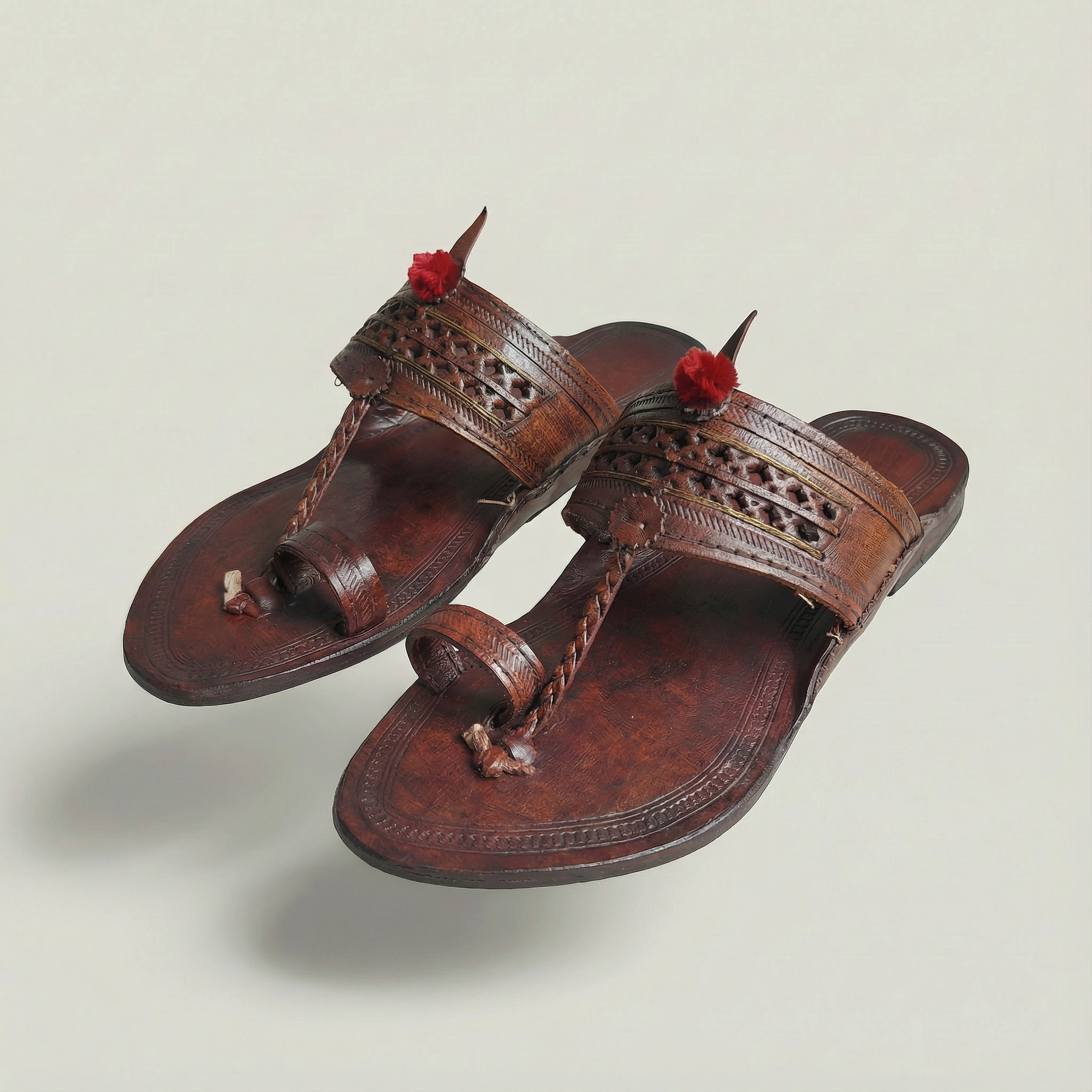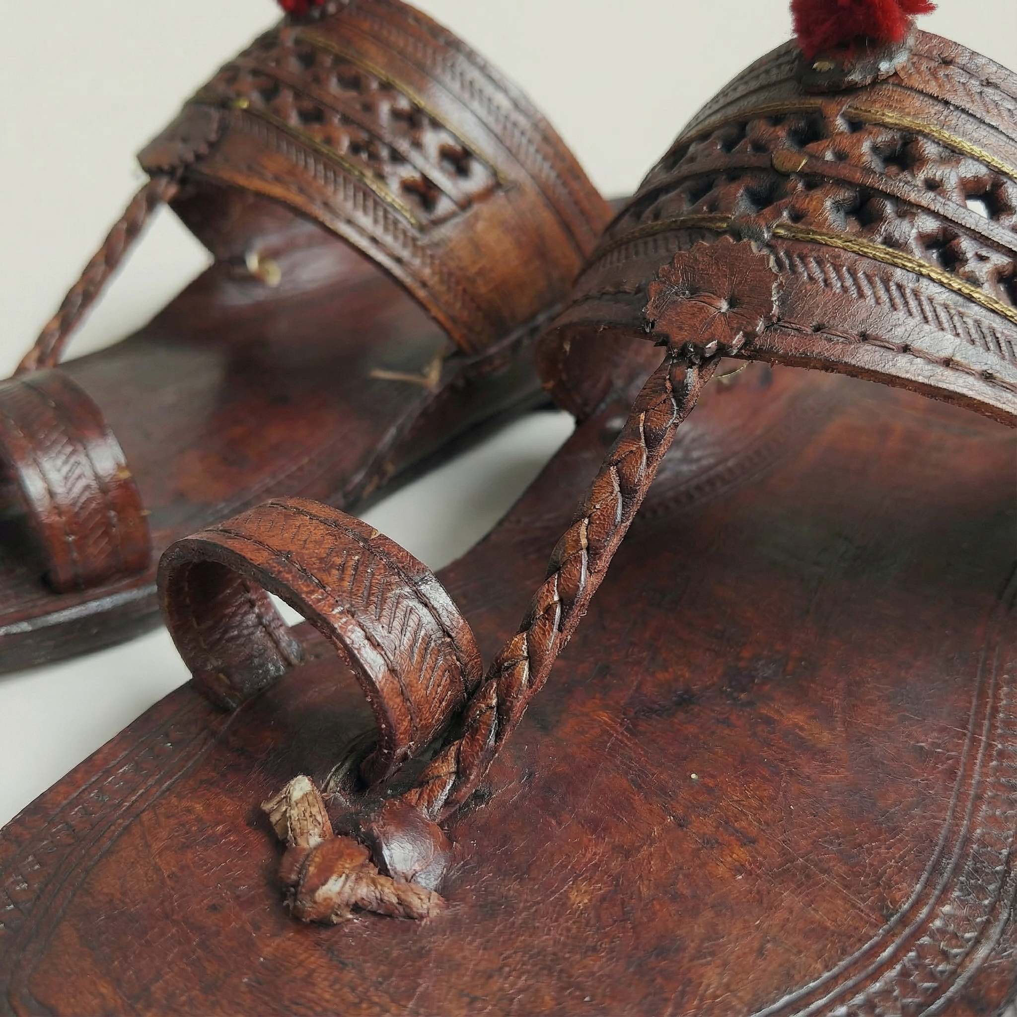 Crafted from rich, vegetable-tanned brown leather, this pair is not only visually striking but also incredibly durable and comfortable. The leather softens with every wear, molding naturally to your foot for a custom, supportive fit. The star-shaped perforations add a beautiful decorative touch, while the braided veni and vibrant red gonda enhance the cultural authenticity of the design.
