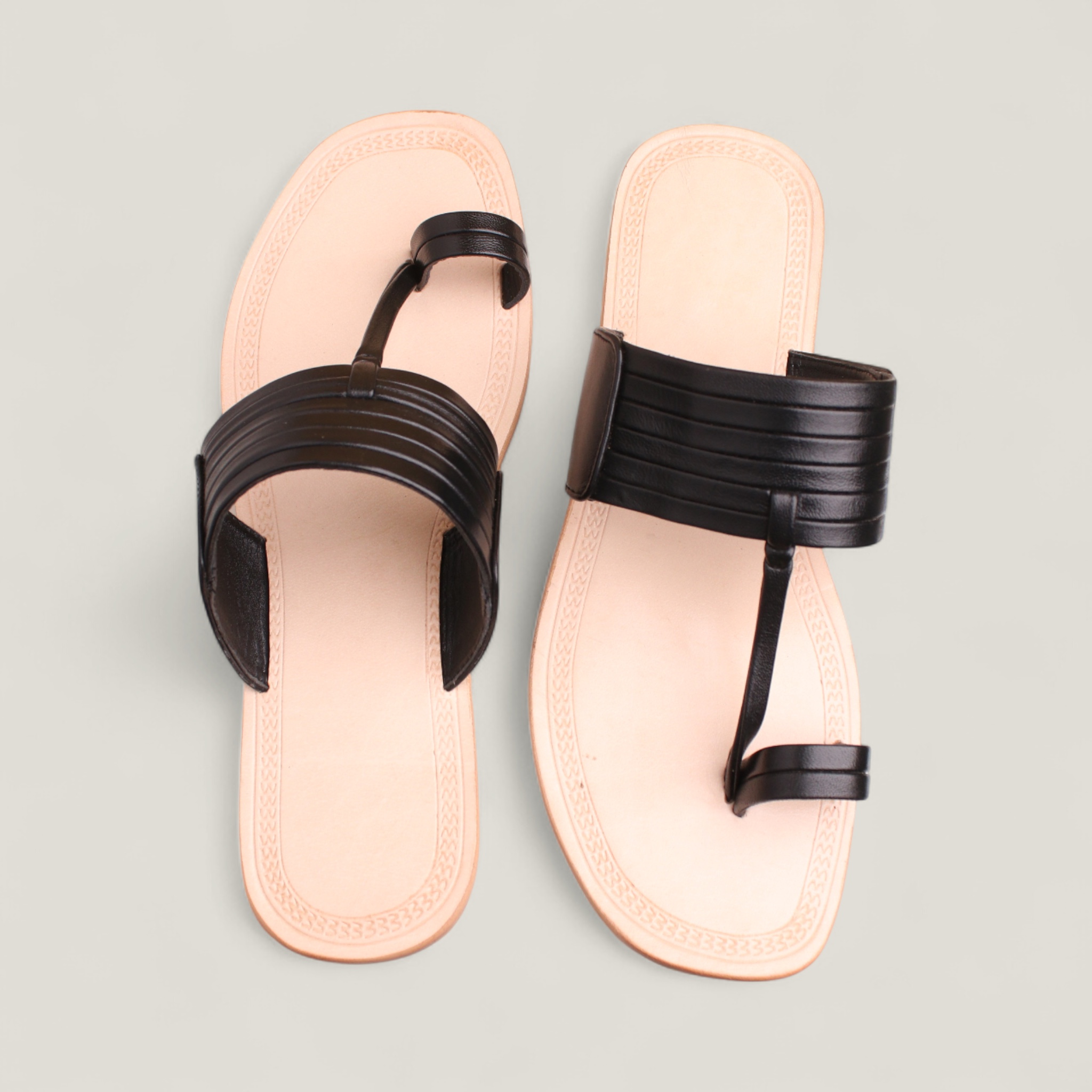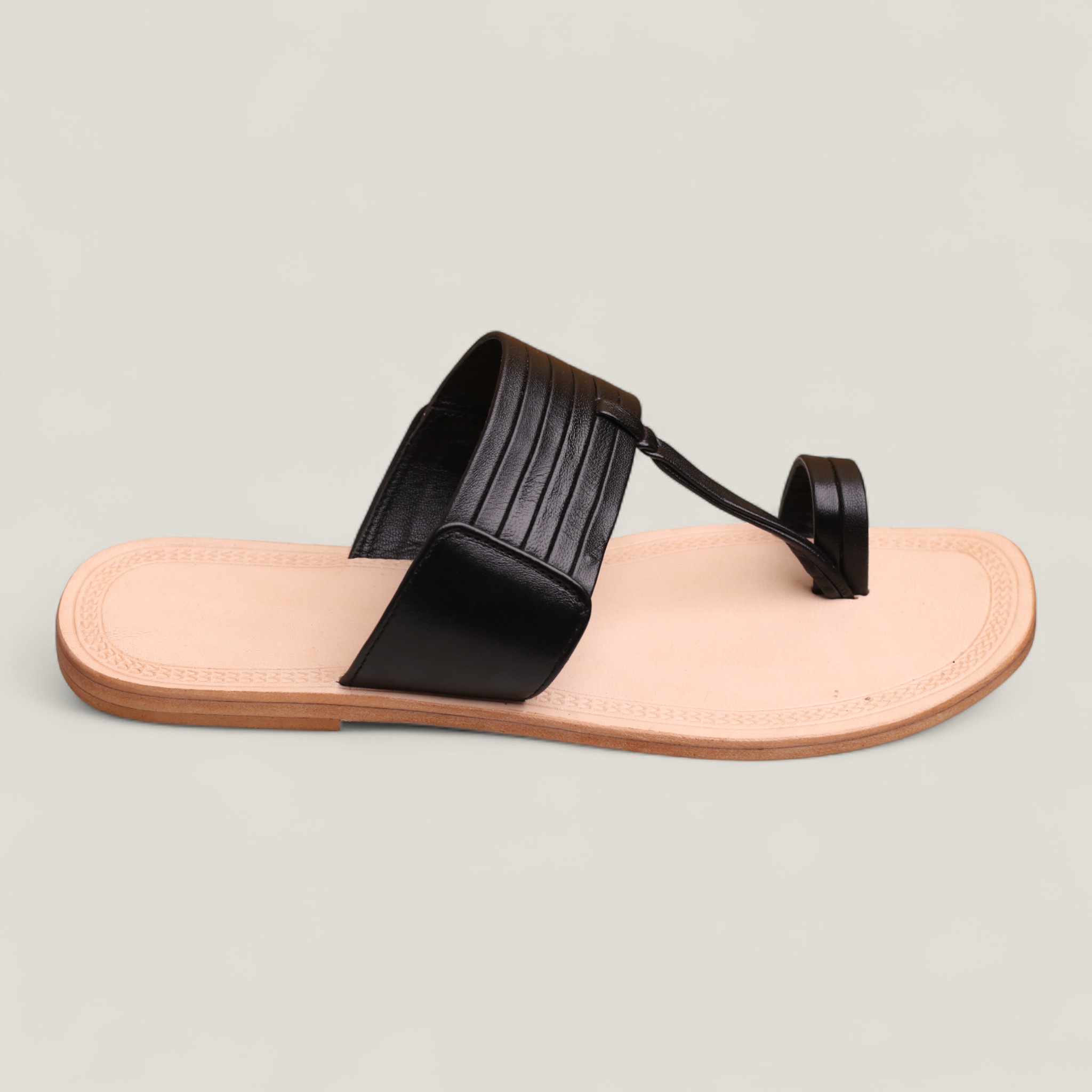 This handmade Kolhapuri chappal features a stylish beige and black design, made from high-quality genuine leather, perfect for everyday casual wear.