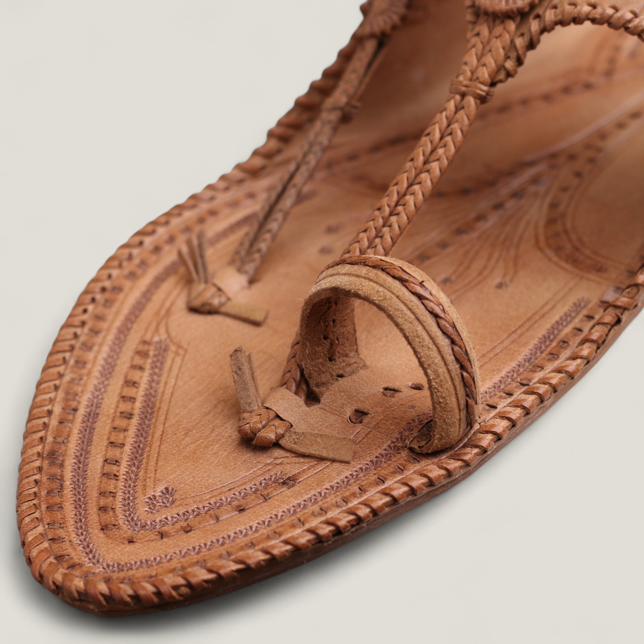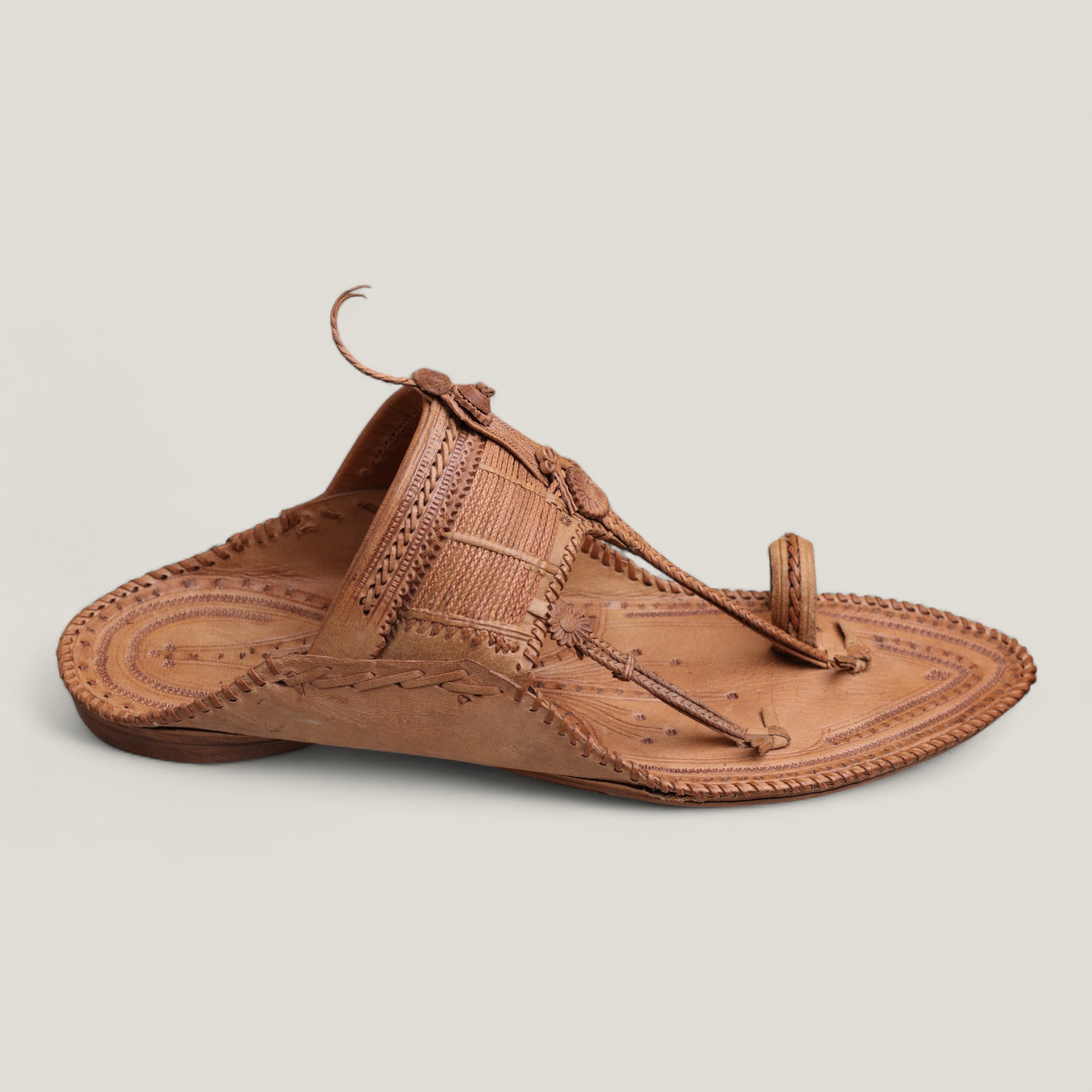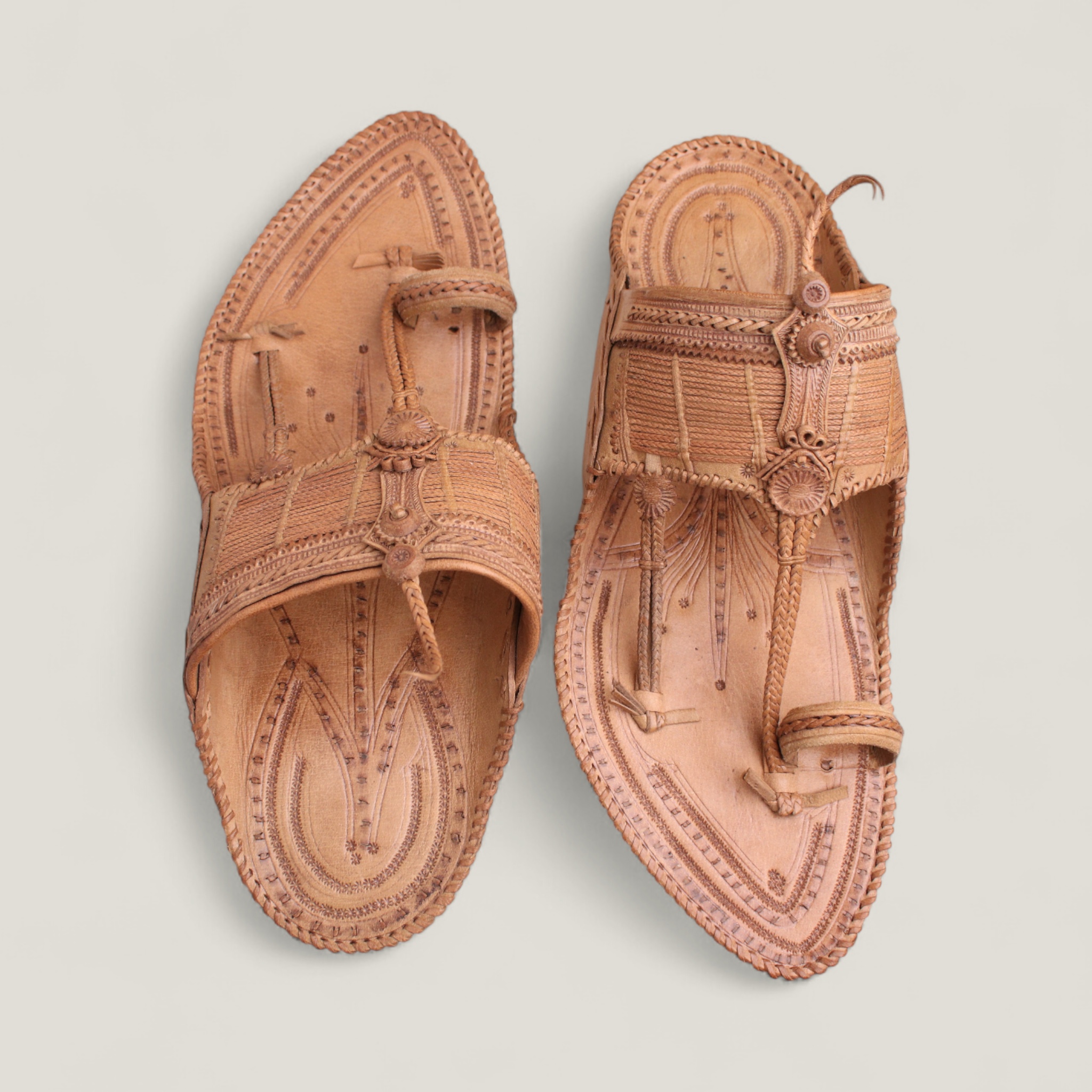 The Kolaap Elegant Men’s Kolhapuri Chappal is a handcrafted leather sandal featuring intricate designs, comfortable toe strap, and rustic yet refined natural tan color.